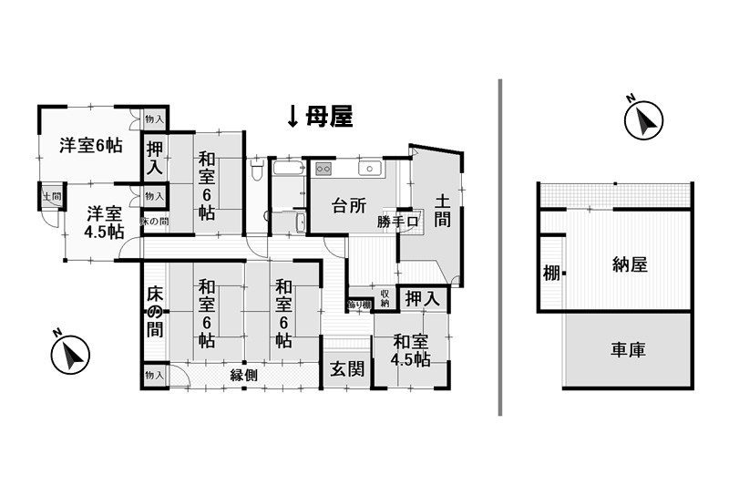 浴室はユニットバス・トイレは浄化槽設置の水洗式です。 - 心和む植栽が植わった敷地の南側に、収納や保管に便利な納屋が付属しています。