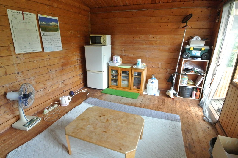 • 休憩や用具の収納に便利なミニログハウスは電気引込済み。